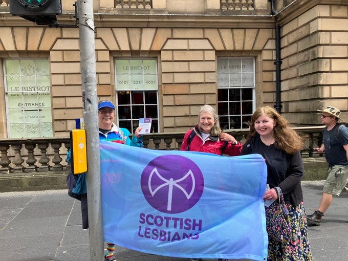 We wanted to raise lesbian visibility. Visibility of the old sort of lesbians, the ones who love and are attracted to other women and who have boundaries and whose oppression is based on the holding of those boundaries. We wanted to hand out some leaflets, because we think there are other lesbians who, for one reason or another, still attend Pride while keeping a low profile, or lesbians who are either just beginning to think about the issues facing us, or are not quite there yet. We weren’t kidding when we called ourselves Scottish Lesbians; we want to continue to grow and reach other lesbians in Scotland and maybe even one day have the time and headspace to work on some of the other issues facing lesbians, if we can get past the current existential crisis. It would be nice not to have to say ‘penis’ or ‘dick’ quite as often as we do now.
